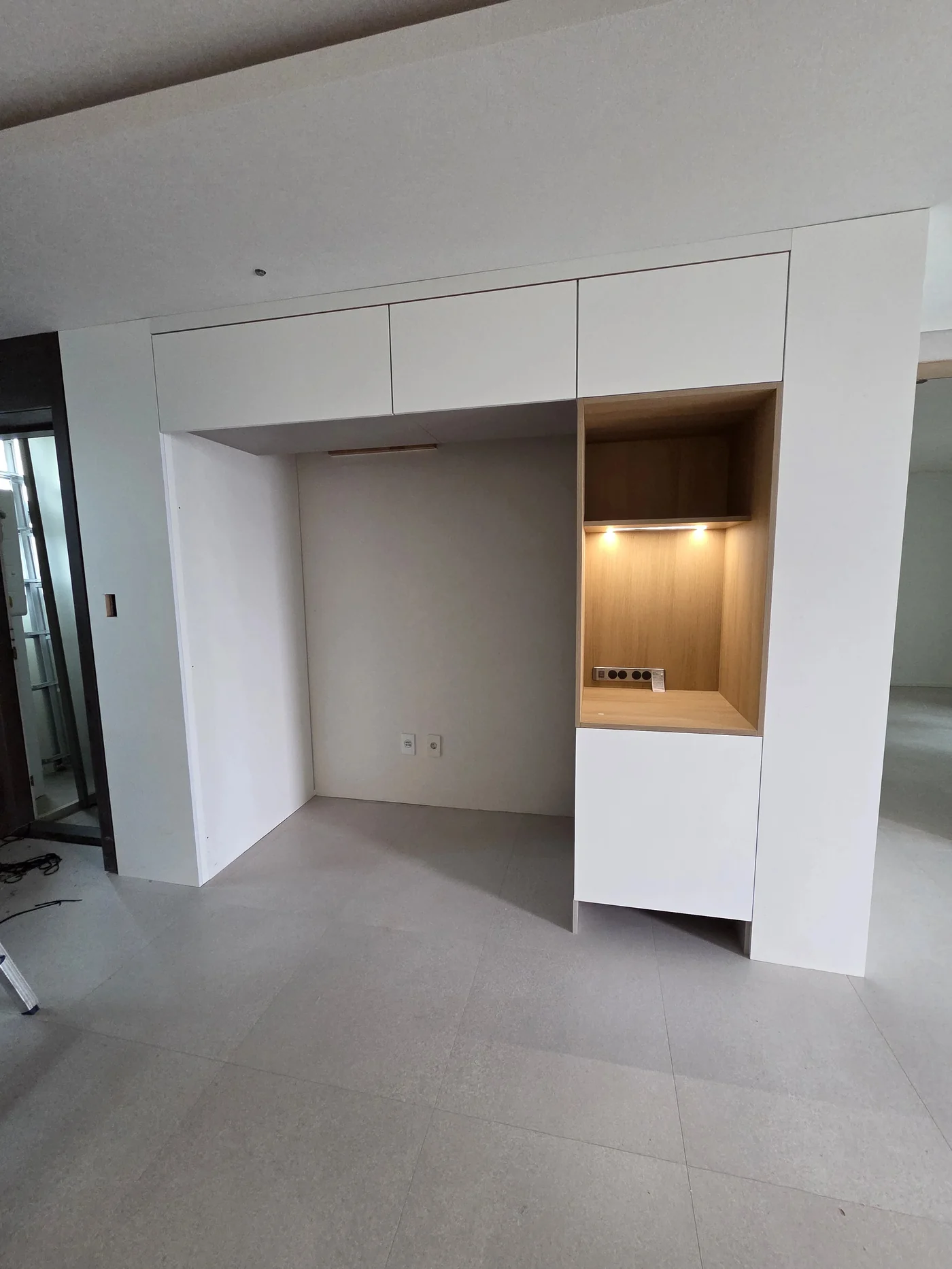 빌트인 냉장고와 달리 프리스탠딩은 방열 요구치가 더 높기 때문에, 상부 5cm·좌우 3cm 이상 방열 여유를 확보한 상태로 프레임을 설계합니다. 이사 계획이 있는 가정에서도 프레임만 분리하면 냉장고는 그대로 가져갈 수 있어 장수명 시공에 적합합니다.
